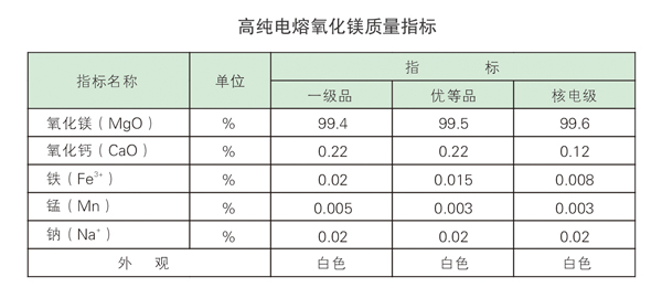 我公司高純電熔氧化鎂制作采用氧化鎂(苦鹵)和碳酸鈉(純堿)化學(xué)合成制得的試劑級高純氧化鎂(海水鎂)經(jīng)3300度電熔爐熔煉而成。此工藝制得的電熔氧化鎂純度高(可達(dá)99.9%),密度大(3.57g/ml)、晶體透明度好,具有優(yōu)良的電絕緣性和熱傳導(dǎo)性(60W/mk),主要用于國防軍工、耐火材料、電熱電器、鎧裝偶絲等行業(yè),產(chǎn)品質(zhì)量各項指標(biāo)達(dá)到或超過美國日本同類產(chǎn)品水平。年產(chǎn)量280噸。